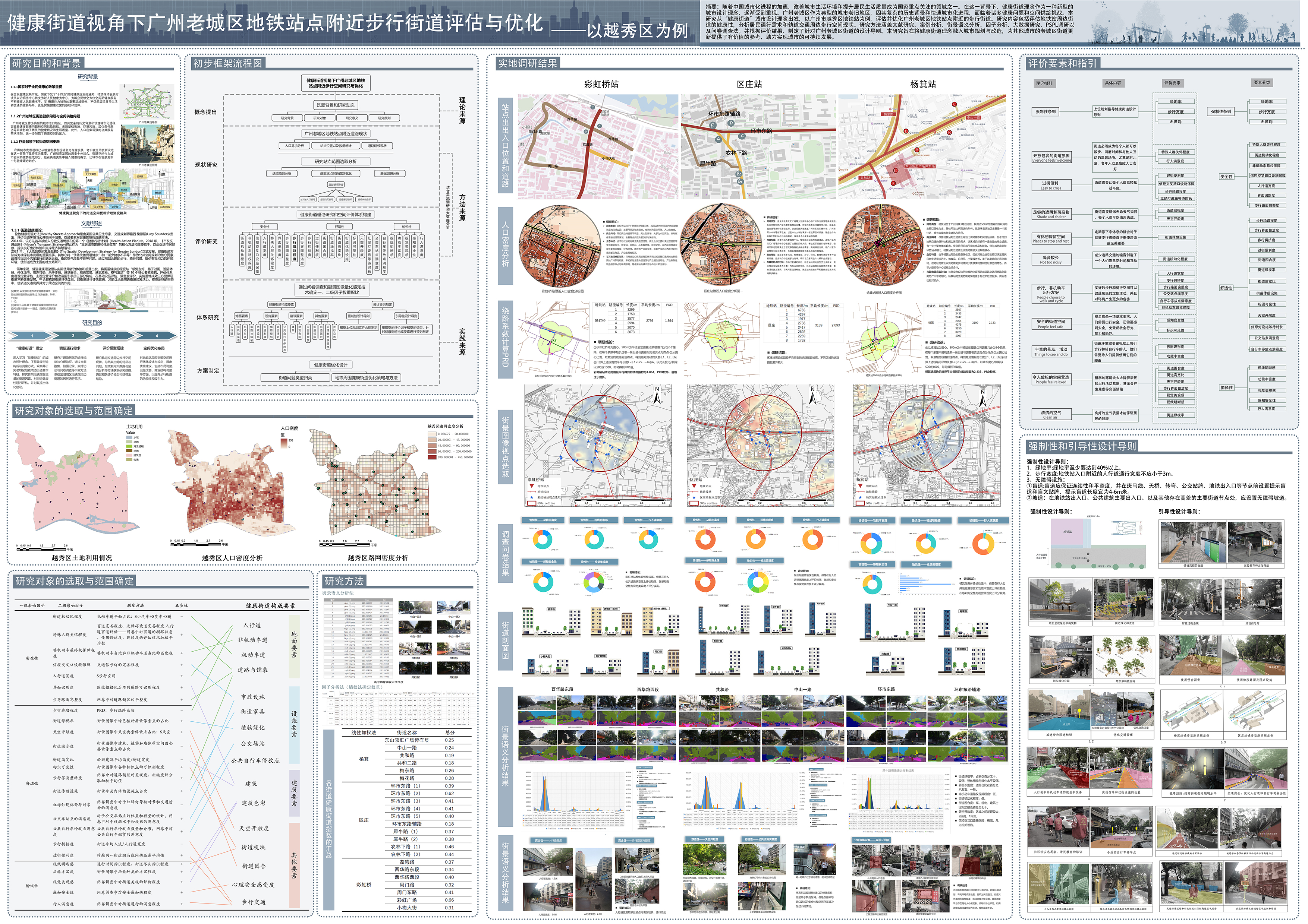 My core task was to build a complete "Spatial Data Quantitative & Evaluation Pipeline" from scratch. Based on GIS analysis of urban land use, population density, and road network density, I scientifically selected three core subway stations in Yuexiu District (Caihongqiao, Ouzhuang, and Yangji) as benchmark subjects. I connected the entire process from "large-scale spatial data sampling" to "deep learning streetscape pixel-level analysis", and finally to "mathematical model objective weighting & road network calculation". The ultimate goal was to accurately diagnose the street health index and precipitate scalable spatial optimization guidelines.